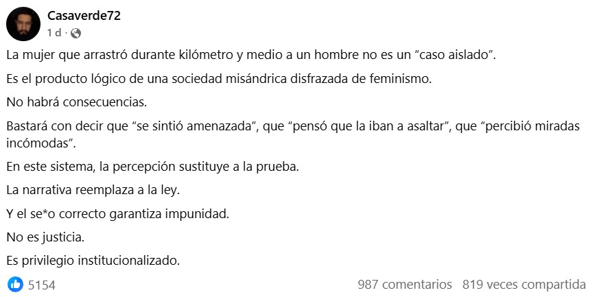 "La mujer que arrastró durante kilómetro y medio a un hombre no es un 'caso aislado'. Es el producto lógico de una sociedad misándrica disfrazada de feminismo. No habrá consecuencias. Bastará con decir que 'se sintió amenazada', que 'pensó que la iban a asaltar', que 'percibió miradas incómodas'. En este sistema, la percepción sustituye a la prueba. La narrativa reemplaza a la ley. Y el se*o correcto garantiza impunidad. No es justicia. Es privilegio institucionalizado."
