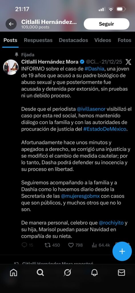 "INFORMO sobre el caso de #Dashia, una joven de 19 años que acusó a su padre biológico de abuso sexual y que posteriormente fue acusada y detenida por extorsión, sin pruebas ni un debido proceso."